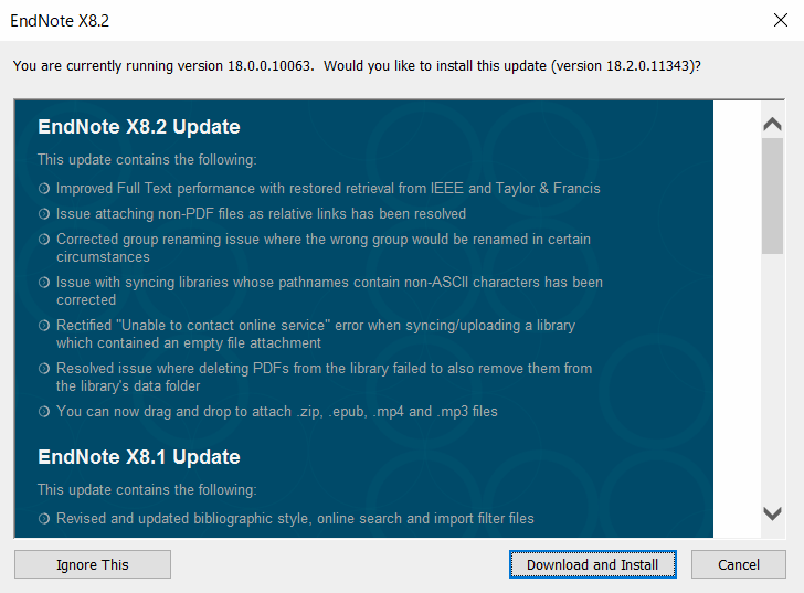 EndNote X8 にはアップデートが配信されており、2019年1月現在の最新バージョンは X8.2 です。