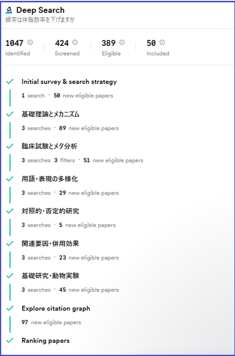 文献上位50件を分析したレポートを、実施したディープ検索の手順、重要知見、考察、結果(Research Gaps Matrix)