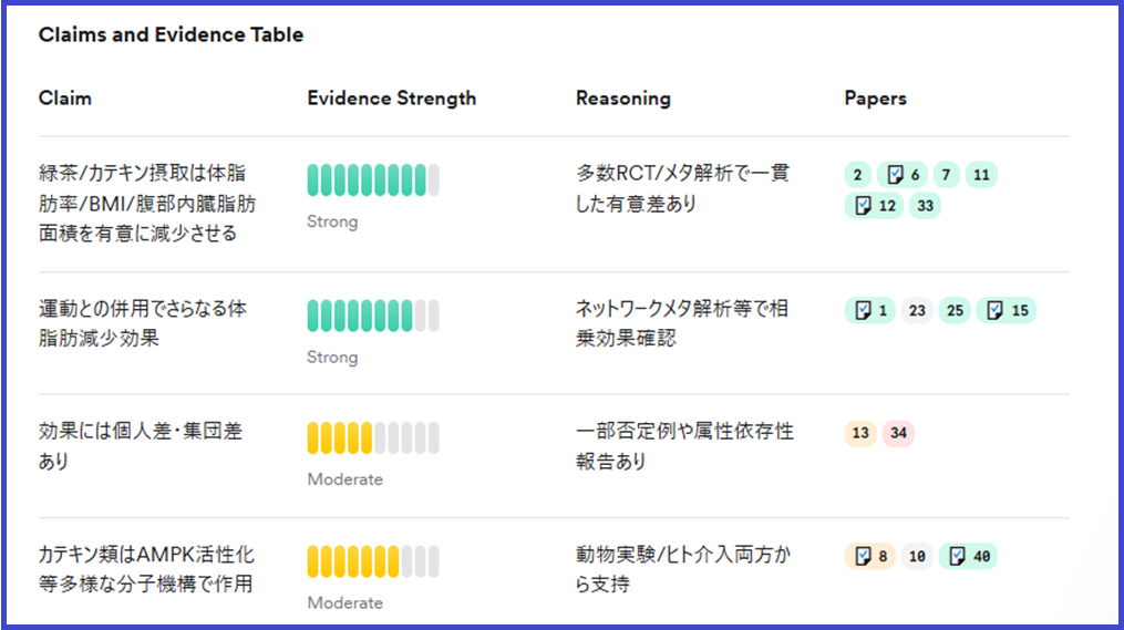 「Yes/No」で答える質問に対し、関連する論文の記載から学術界の見解を視覚的に表示します。